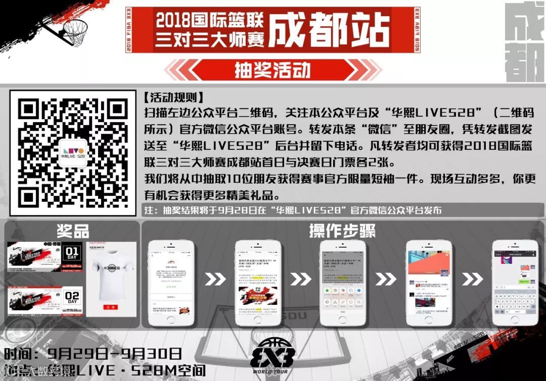 扫描左边公众平台二维码,关注本公众平台及“华熙LIVE528”(二维码所示)官方微信公众平台账号。转发本条“微信”至朋友圈,凭转发截图发送至“华熙LIVE528”并留下电话。凡转发者均可获得2018国际篮联三对三大师赛成都站首日与决赛日门票各2张。