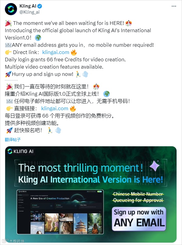 本月22号,快手可灵发了一个公告,海外版可灵即将上线。24日官宣,其AI视频产品可灵国际版1.0正式上线。用户只需提供邮箱即可注册使用,无需中国手机号码,每日登录还能获得66个免费积分试用。