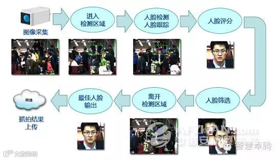 摄像机实现监控图像的人脸捕捉、抓拍、识别和布控比对报警。人脸抓拍机在能够对经过设定区域的人员进行人脸检测和人脸跟踪,利用人脸质量评分算法能自动筛选出一张人的正面脸部信息最为清晰的人脸图像作为该人员的抓拍图像。并把人脸照片、抓拍地点、抓拍时间等信息上传到人脸管理平台进行存储,进行统一存储,以方便后期的检索与查询。具体流程如下图所示。