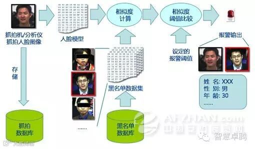 对比建模:对人脸抓拍机传送过来的人脸照片进行建模。同时实时和黑名单数据库的人员进行比对。