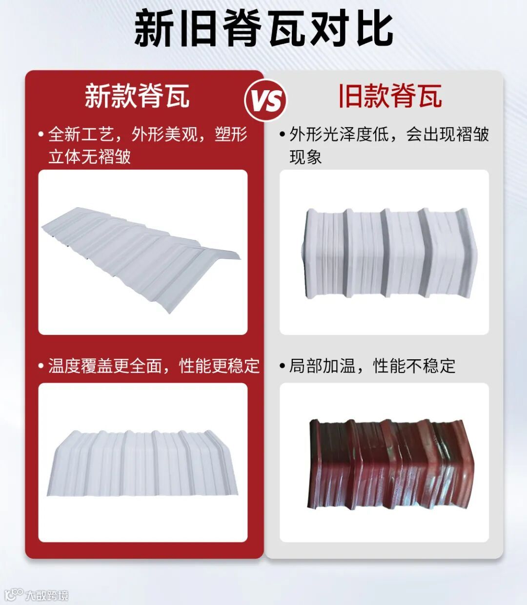 ① 外形更美观:经新模具挤压成型的V瓦棱角分明,塑形立体,无褶皱;