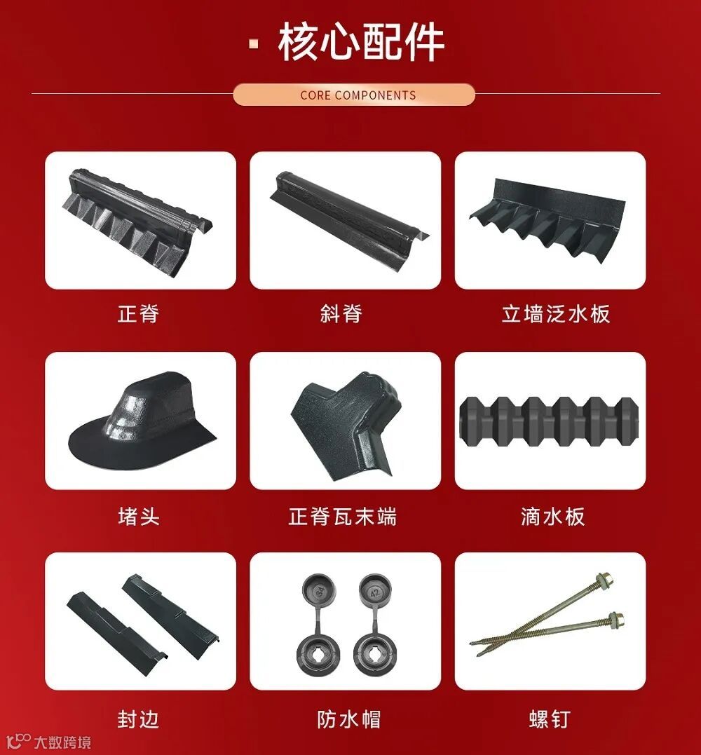 我们不仅提供主瓦,还配有专用的斜脊、堵头、立墙泛水板、滴水板、封边、防水帽、螺钉等核心配件,实现屋面、墙角、檐口的全方位密封防水。