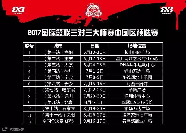 由华熙国际文化体育发展有限公司倾力打造的 世界级草根篮球盛宴——2017国际篮联三对三(FIBA3x3)大师赛中国区预选赛 将在全国11个城市拉开战幕。这11座城市的冠军将于9月中旬重新集结,参加在成都举行的全国总决赛。