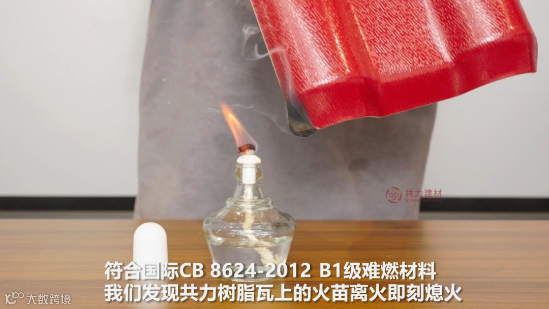 更重要的是,共力树脂瓦具有良好的阻燃性能,防火等级符合国际CB8624-2012 B1级要求,遇明火不易燃烧,能有效阻止火势蔓延,为生命财产安全增添有力保障,让安全防护在极端天气可能引发的各类风险中时刻在线。同步通过SGS认证,其使用寿命突破30年,综合维护成本也大幅降低。
