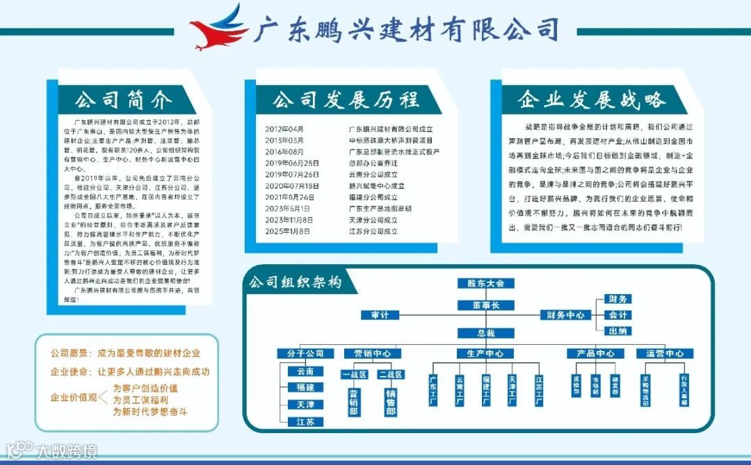 十三载峥嵘岁月,满怀憧憬与热忱,今天我们欣然宣布:广东鹏兴建材公司总部正式乔迁至广东工厂新址,开启“产销一体”的全新征程!我们从写字楼到新工厂大楼的跨越,不仅是一次空间的升级,更是对我司“为客户创造价值,为员工谋福利,为新时代梦想奋斗”之核心价值观的深度践行。此刻,我们诚邀您走进焕然一新的总部,共同见证制造力量与服务温度的融合之美!