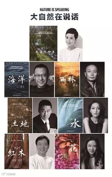 由国际性非营利环保机构——保护国际基金会发起名为《大自然在说话》的系列公益短片,蒋雯丽、姜文、葛优、陈建斌、周迅、濮存昕、汤唯分别为大自然母亲、海洋、雨林、土地、水、红木、花发声。这一次,保护国际基金会集齐了一大批明星,能让耳朵怀孕的好声音,说出了一直默默付出而被我们忽视的大自然的心声。