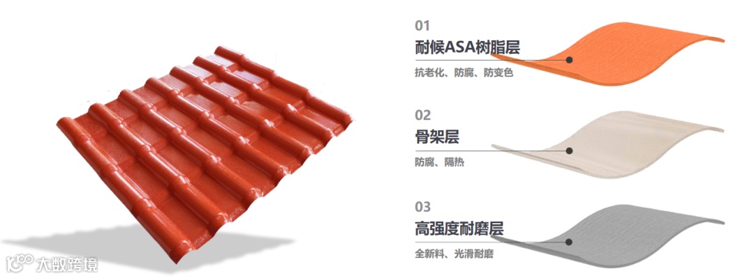 共力树脂瓦采用先进的三层共挤技术(A/B/C)技术,一次加工而成。采用全新原材料制作,每24小时进行抽样检查,产品质量更稳定。