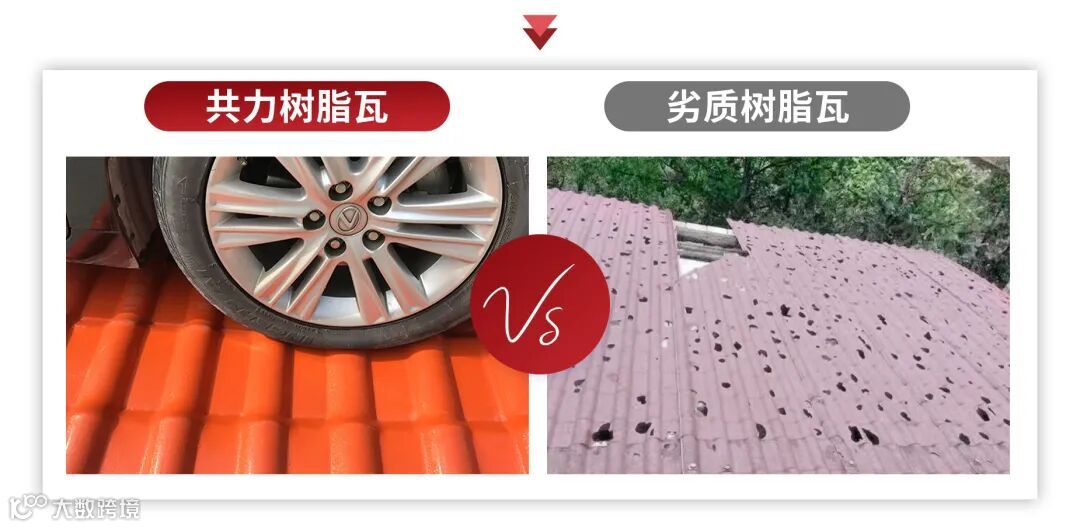优质的合成树脂瓦具有很强的冲击承受能力,能承重200斤以上,经实验1公斤钢球从3米高空自由落下不会产生裂纹,低温下抗冲击能力也十分显著,质保可到35年;劣质的合成树脂瓦由于采用回收料制作,导致瓦面易碎,徒手折断,长期暴露在高温和低温环境下,使用寿命会缩短至3-5年。