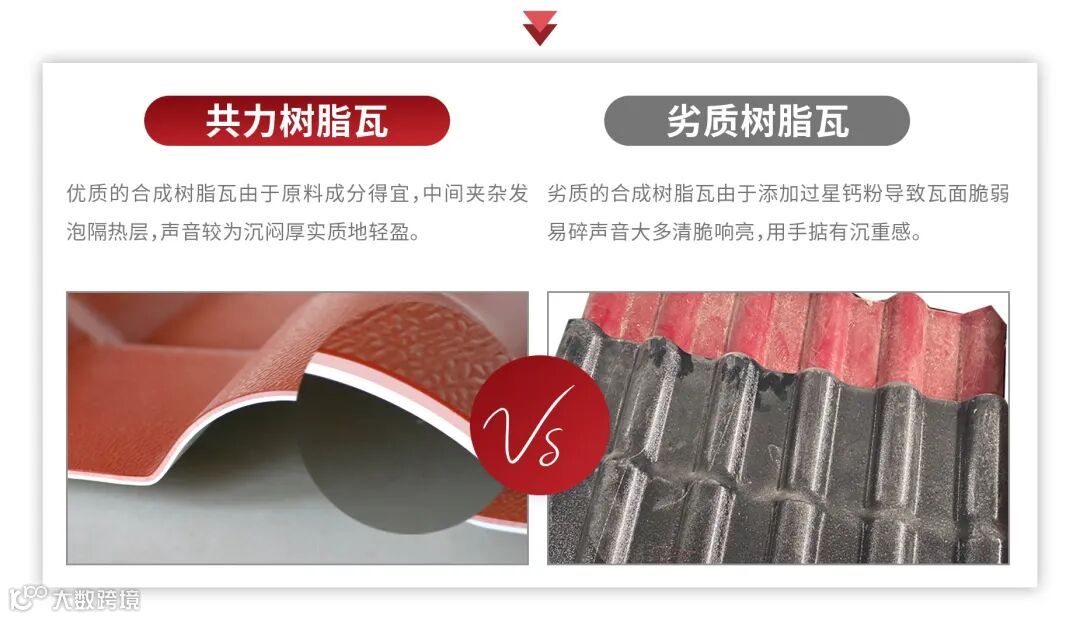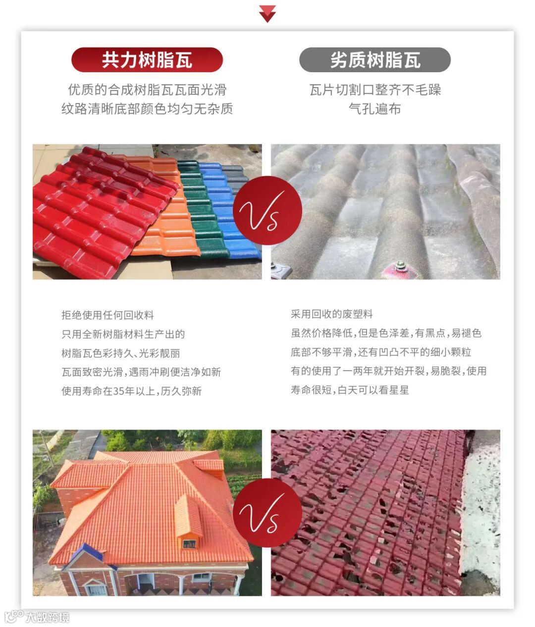 优质的合成树脂瓦瓦面光滑、纹路清晰,底部颜色均匀无杂质;劣质树脂瓦瓦片切割混乱毛躁,气孔遍布;色泽差、有黑点、易褪色、底部不够平滑,还有凹凸不平的细小颗粒,使用年限短!