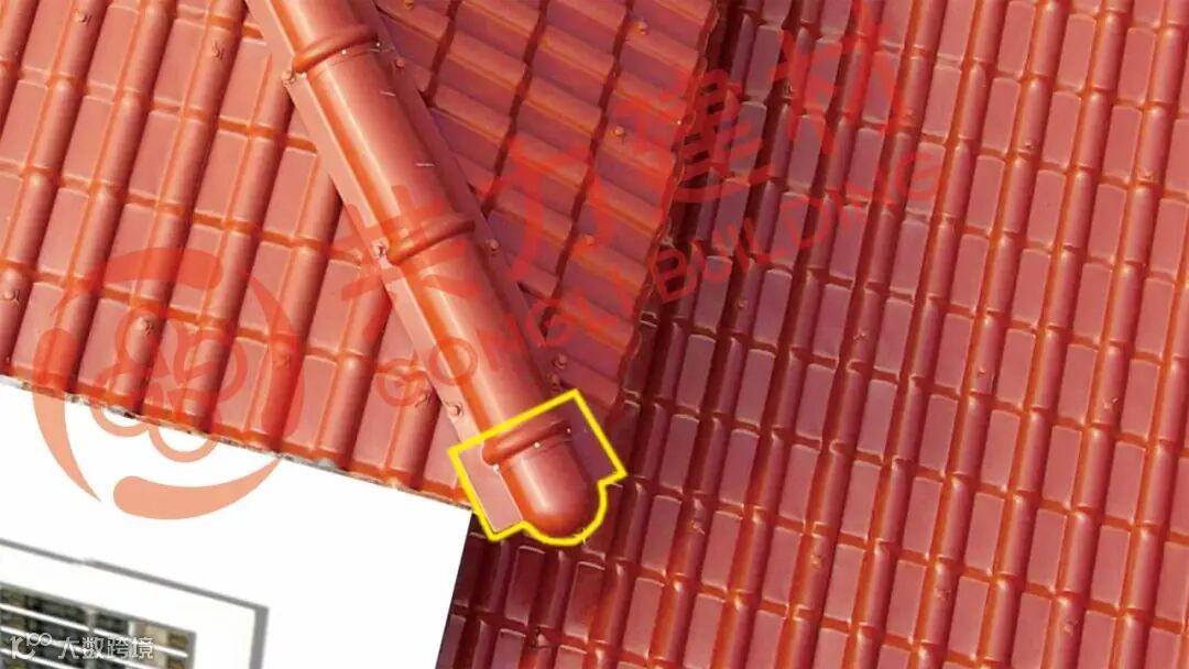 将斜脊瓦封头放在斜脊瓦末端,用螺丝固定在斜脊瓦的两边,防止水流滴入建筑内