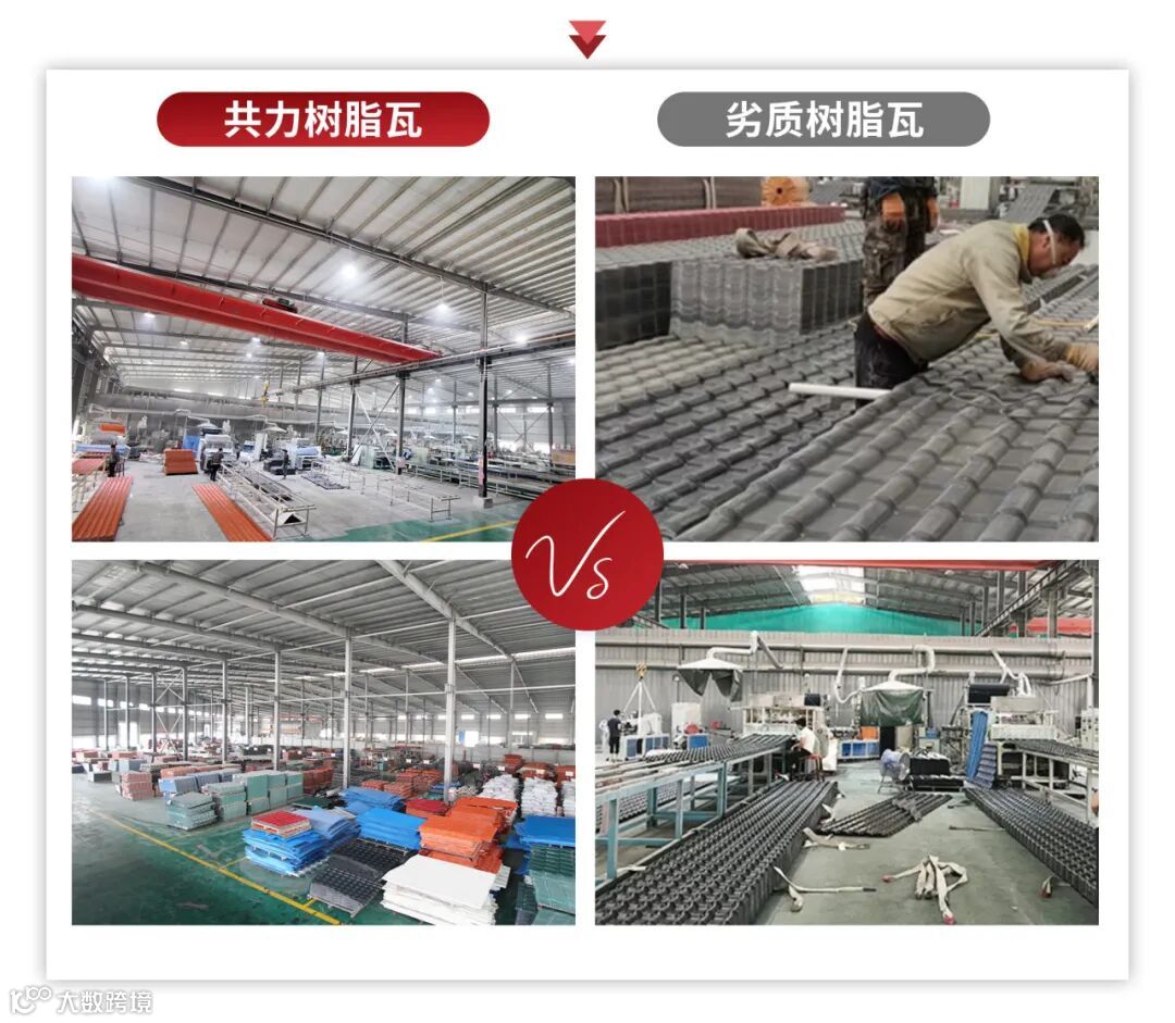 共力树脂瓦是建材行业的领军品牌,产品具有多项专利,出厂标准具有防伪标识。且共力出厂的所有产品皆采用全新原材料制作和先进的三层共挤技术制作而成,制作厚度达到0.15微米,优于行业标准的1.5倍,做到10年不褪色!