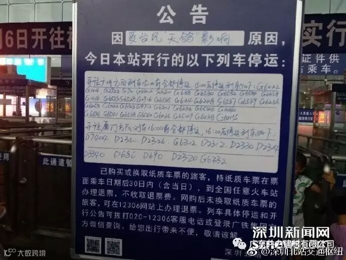 铁路部门将密切关注台风影响程度,及时调整受影响线路列车恢复开行时间。有关列车停运及恢复开行等具体信息,请广大旅客朋友及时关注车站公告,也可登陆广州铁路官方微博微信或拨打12306客服电话查询。