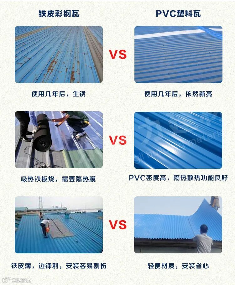随着屋面建材行业的发展,PVC瓦逐步替代彩钢瓦、镀锌瓦等传统瓦,成为屋面领域的防腐守护者。使用PVC瓦的厂房屋顶,不会出现因使用彩钢瓦(铁皮瓦)而造成的生锈,穿孔、漏水的现象。