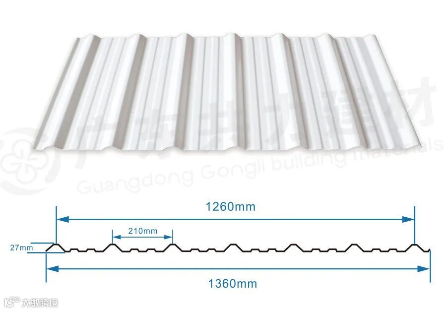 1360型梯形瓦,以PVC为主要原材料,通过科学的配比和先进的生产工艺技术制成。在紫外线吸收、光稳定、抗氧化等方面增加了优质配方。