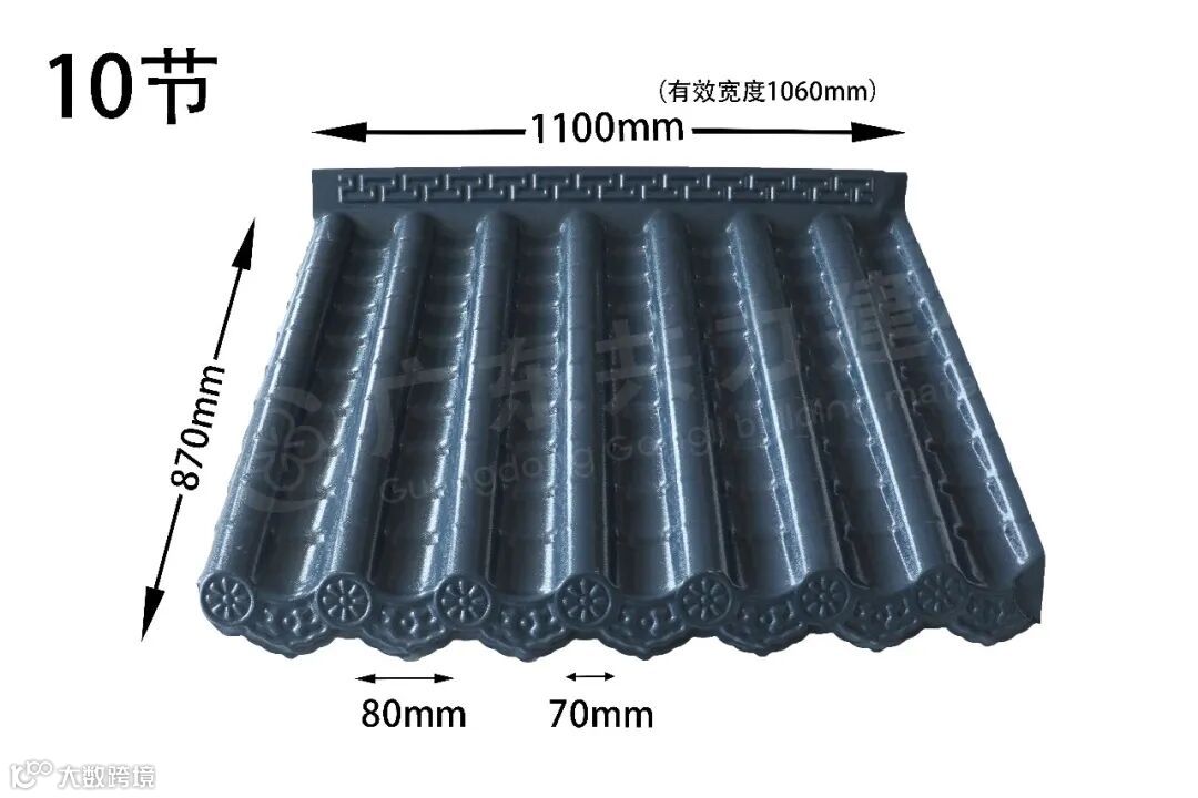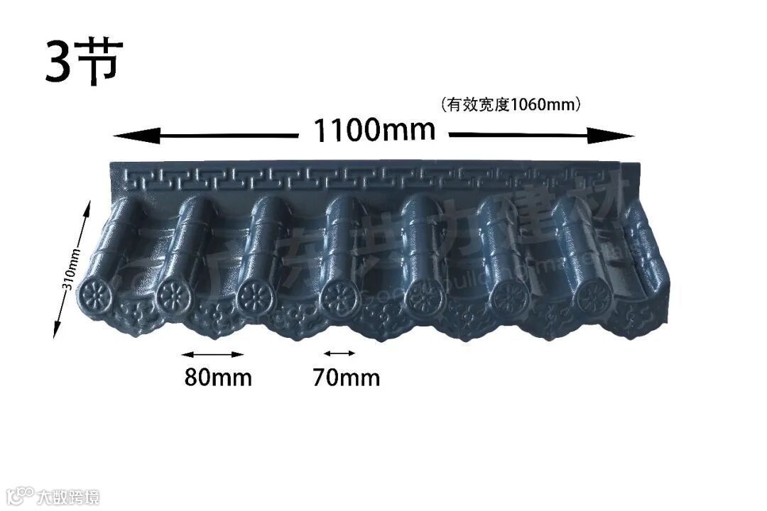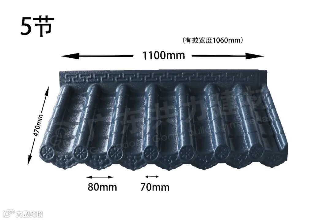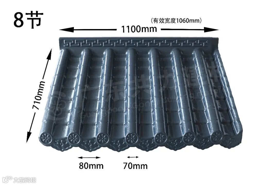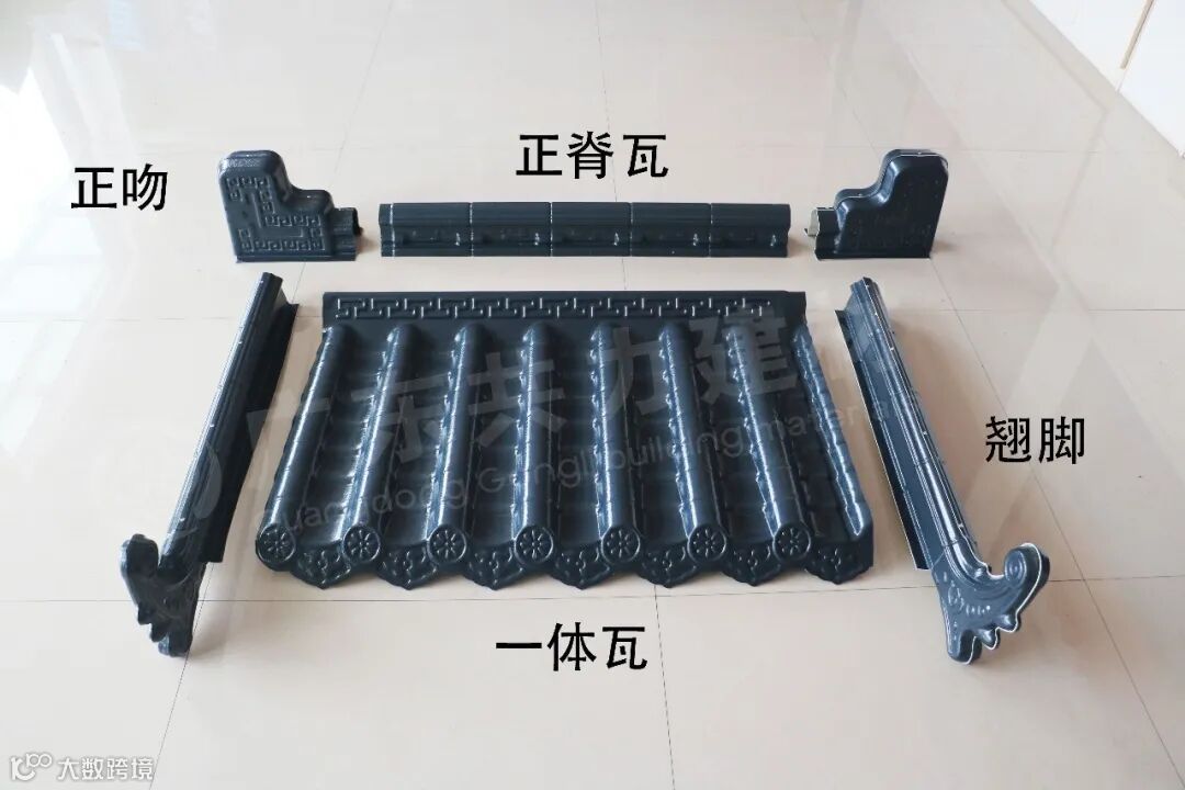 共力仿古一体瓦一体化铸造而成,檐口平整光滑,使用进口ASA原材料,经久耐用。印有精美花纹,独特设计,更显优雅。
