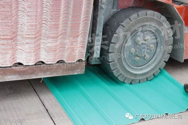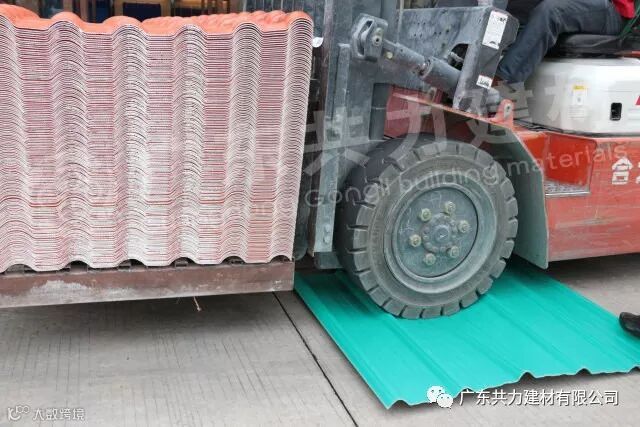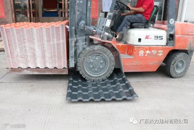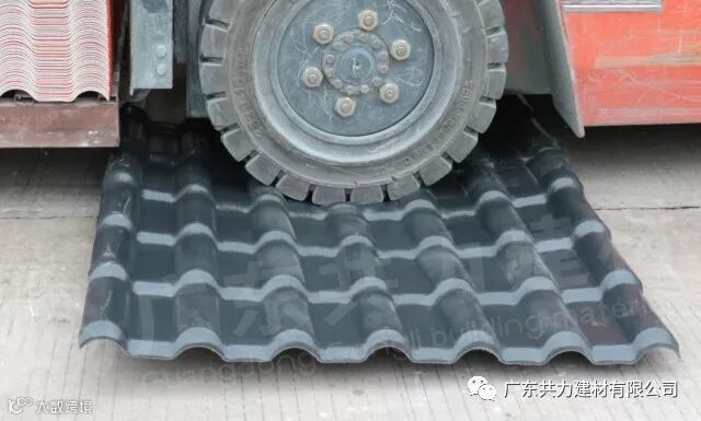 实心轮子的叉车+瓦重量=6吨,6吨重量直接压过共力ASA合成树脂瓦,树脂瓦表面没有产生任何裂痕。