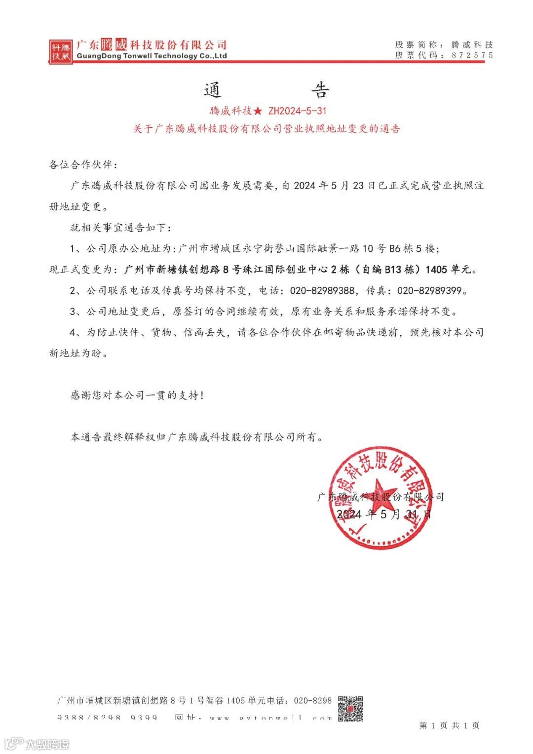广东腾威科技股份有限公司因业务发展需要,现已乔迁至:广州市增城区新塘镇创想路8号珠江国际创业中心,营业执照于5月23日完成地址变更。