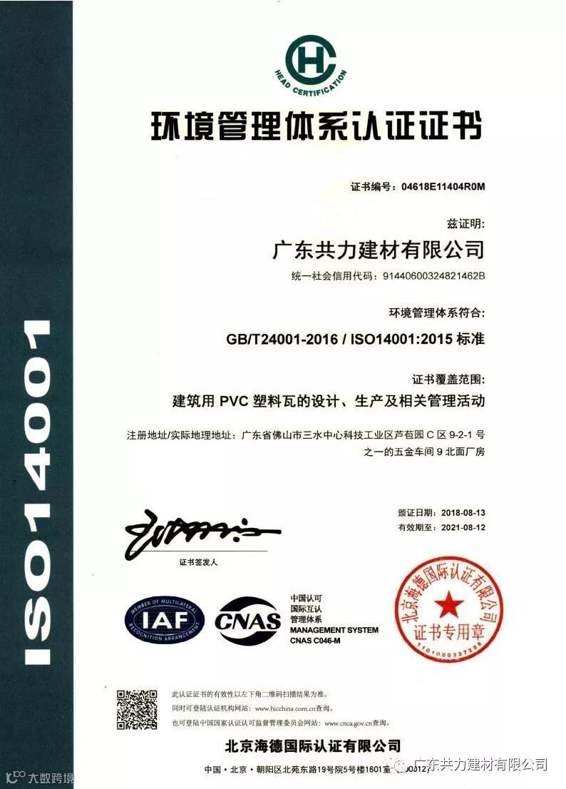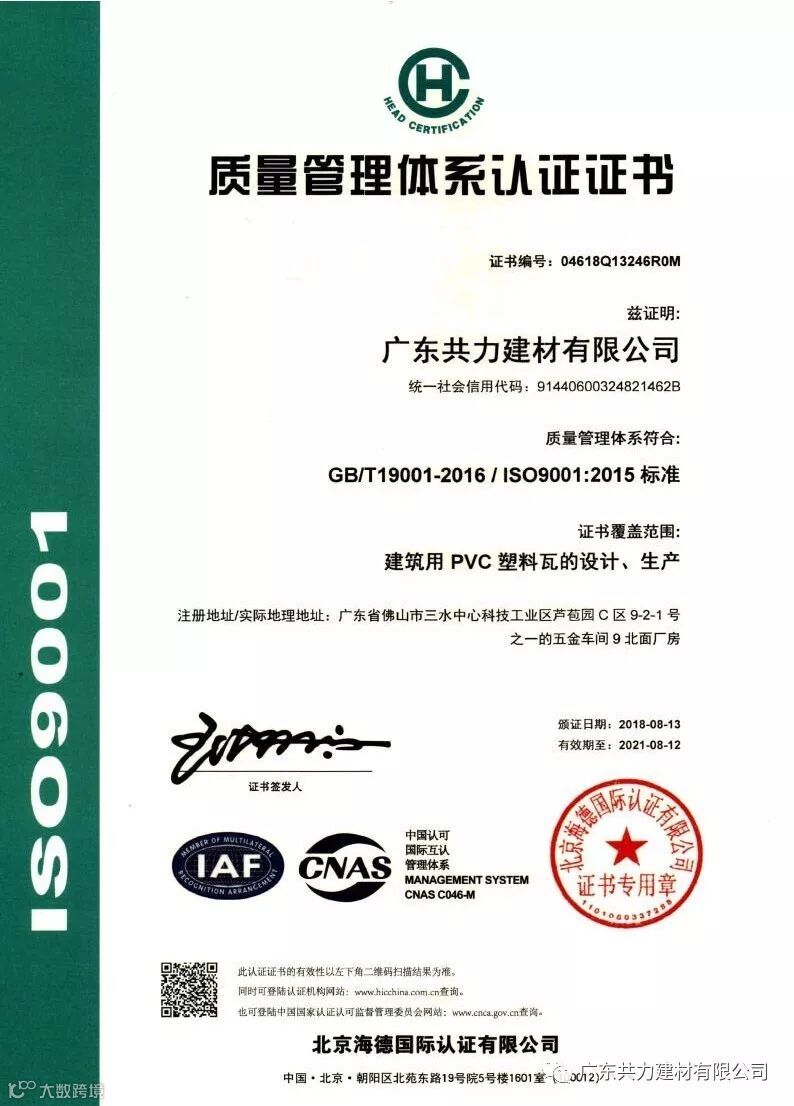共力全面通过IS014001环境管理体系及IS09001质量管理体系认证,产品已通过国际标准SGS认证、国家化学实验室检测、佛山市AL质量认证。