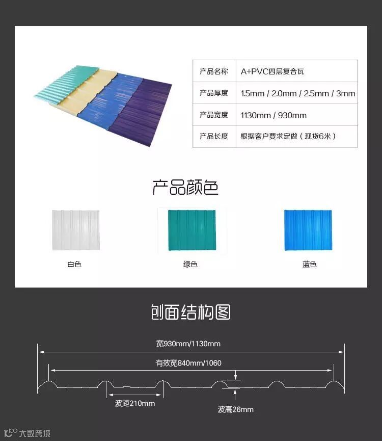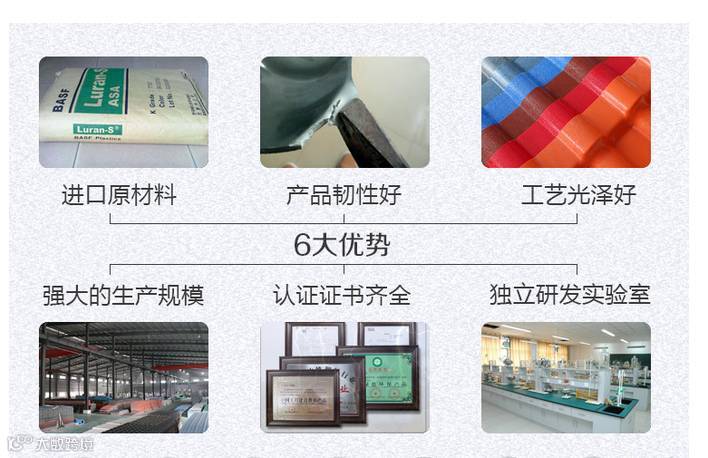 共力合成树脂瓦采用先进的三层共压技术,表面材料A层:为候耐性树脂;中间材料C层:PVC材质;底层材料B层:次耐候层和白色韧性耐磨材料。一次加工而成,所用原材料均是优质公司提供的全新材料。