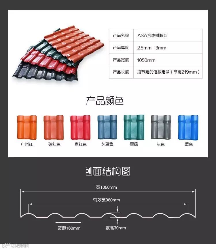ASA合成树脂瓦系列、ASA复合瓦系列、PVC塑钢瓦系列、透明瓦系列和各种配套配件等。是国内同行生产品种系列最全的公司之一,产品的多样化满足不同客户的需求。