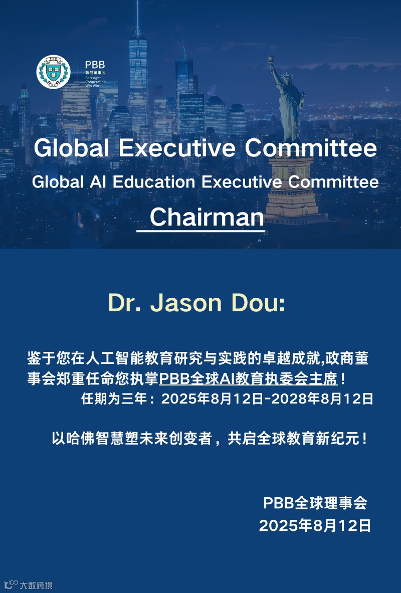 政商董事会(Polity Business Board) 正式任命哈佛人工智能教育先锋Dr.Jason Dou担任PBB全球人工智能教育执委会主席。此次任命基于Dou博士在AI教育领域的卓越成就与政商董事会“前瞻·合作·共赢”愿景的高度契合,标志着PBB加速布局人工智能时代的教育革新战略。