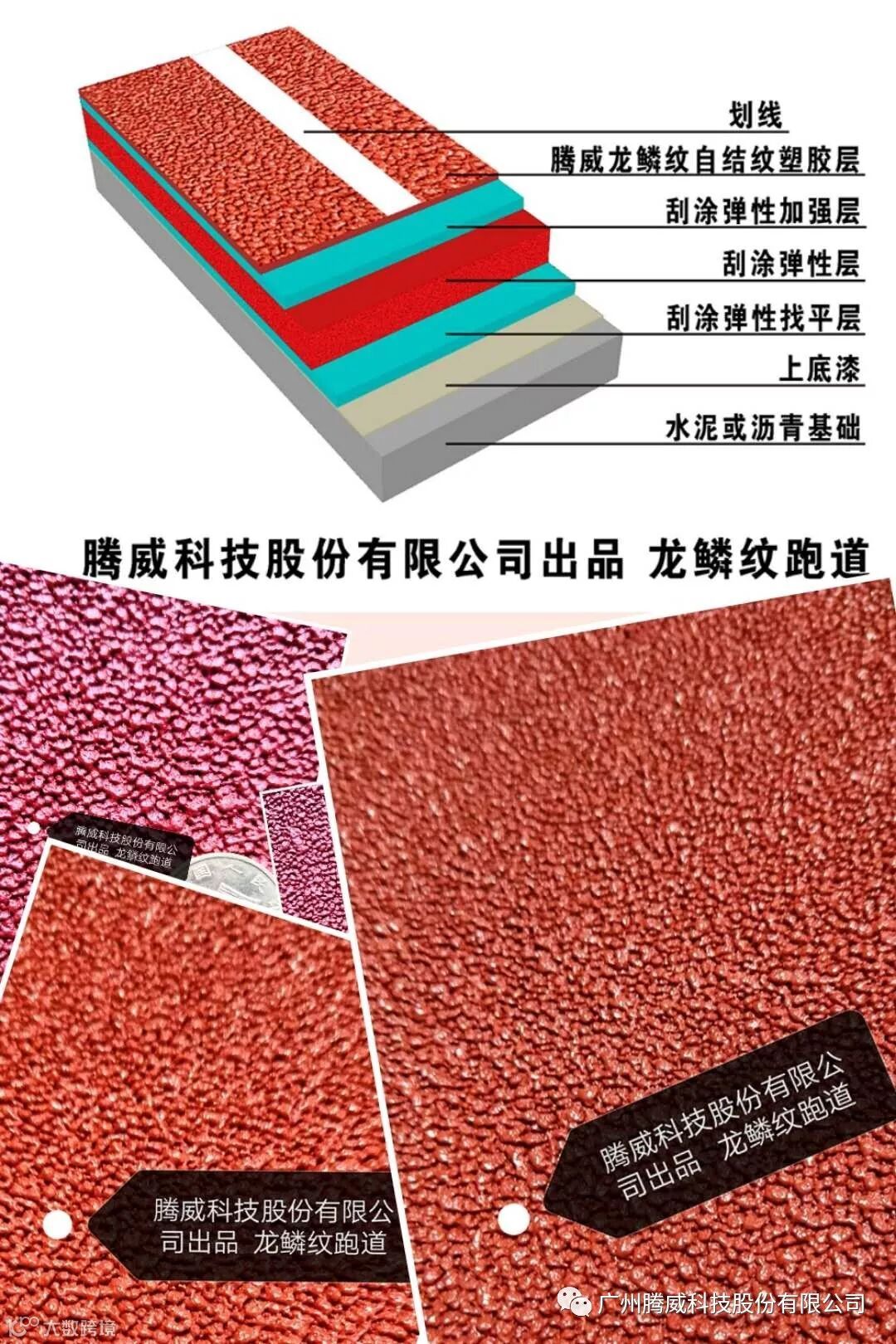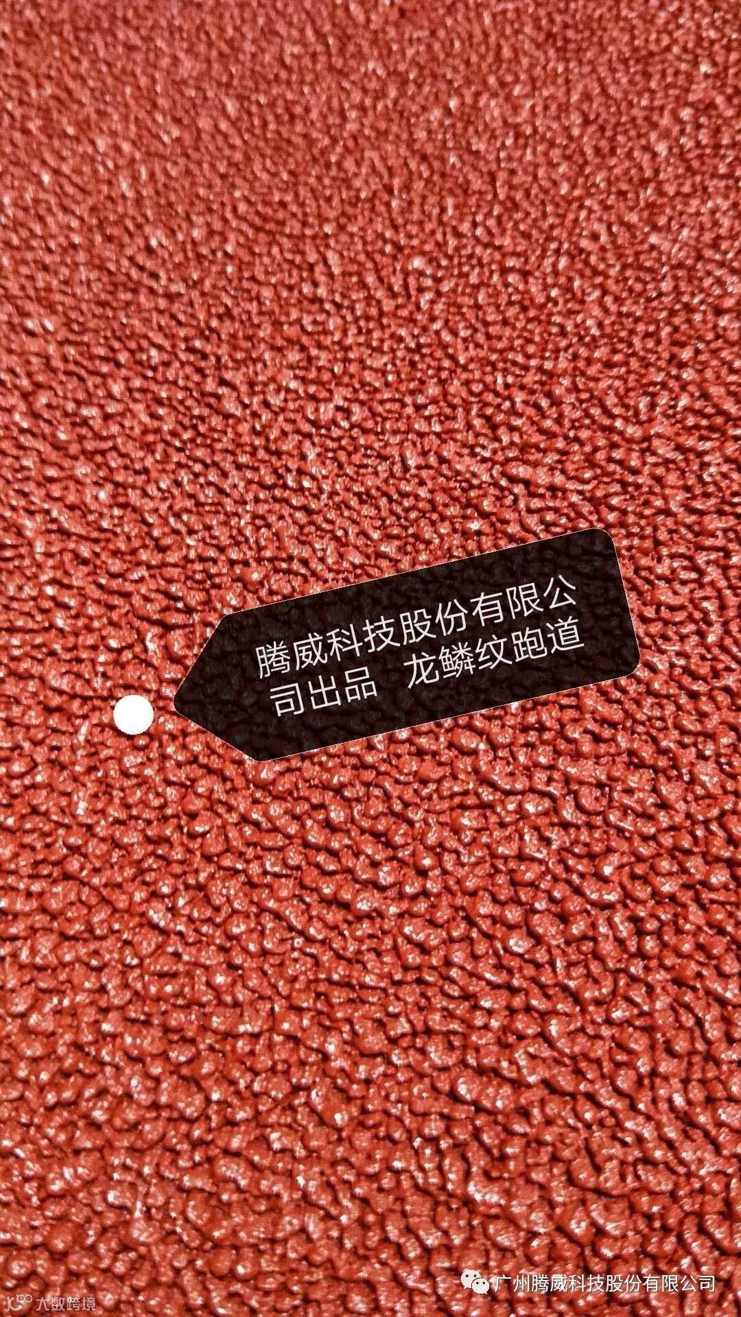 8、各向同性:腾威科技创新研发的的荔枝纹、龙鳞纹塑胶自结纹喷面凸起花纹前后左右四个方向花纹均匀一致,可以为运动地面各个方向提供一致的摩擦系数,确保运动员在不同跑道、不同方向得到一致公平的运动成绩。