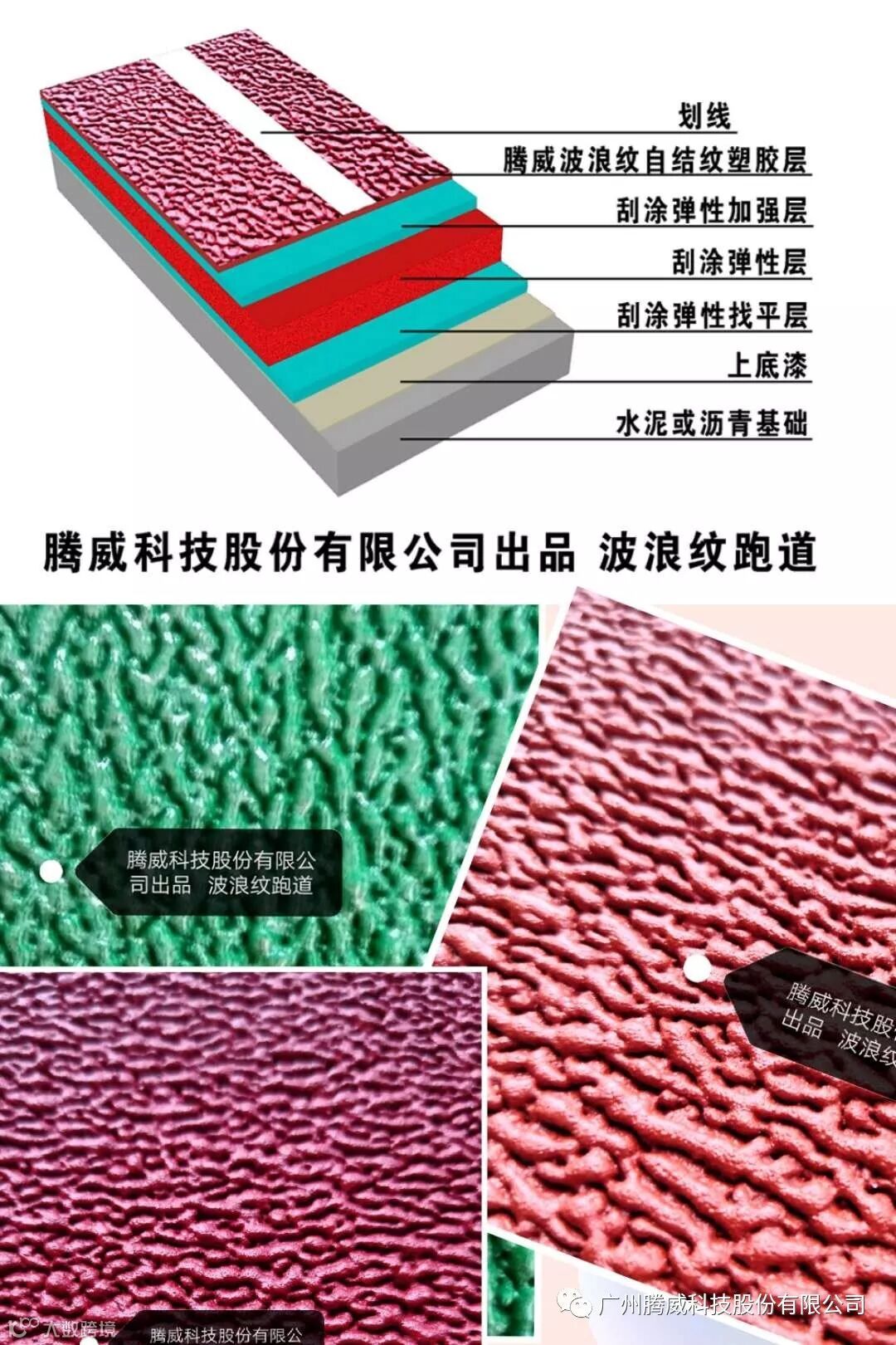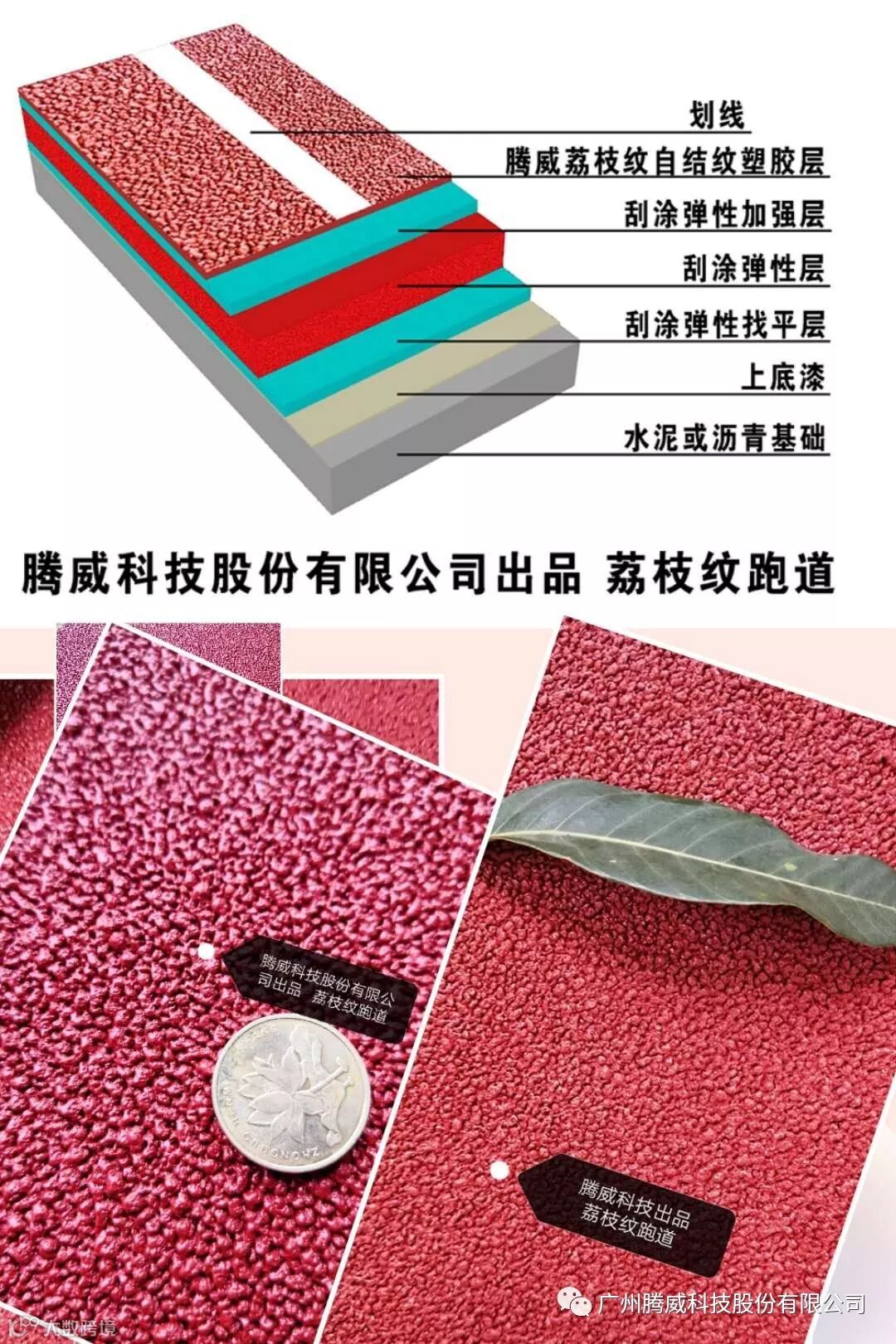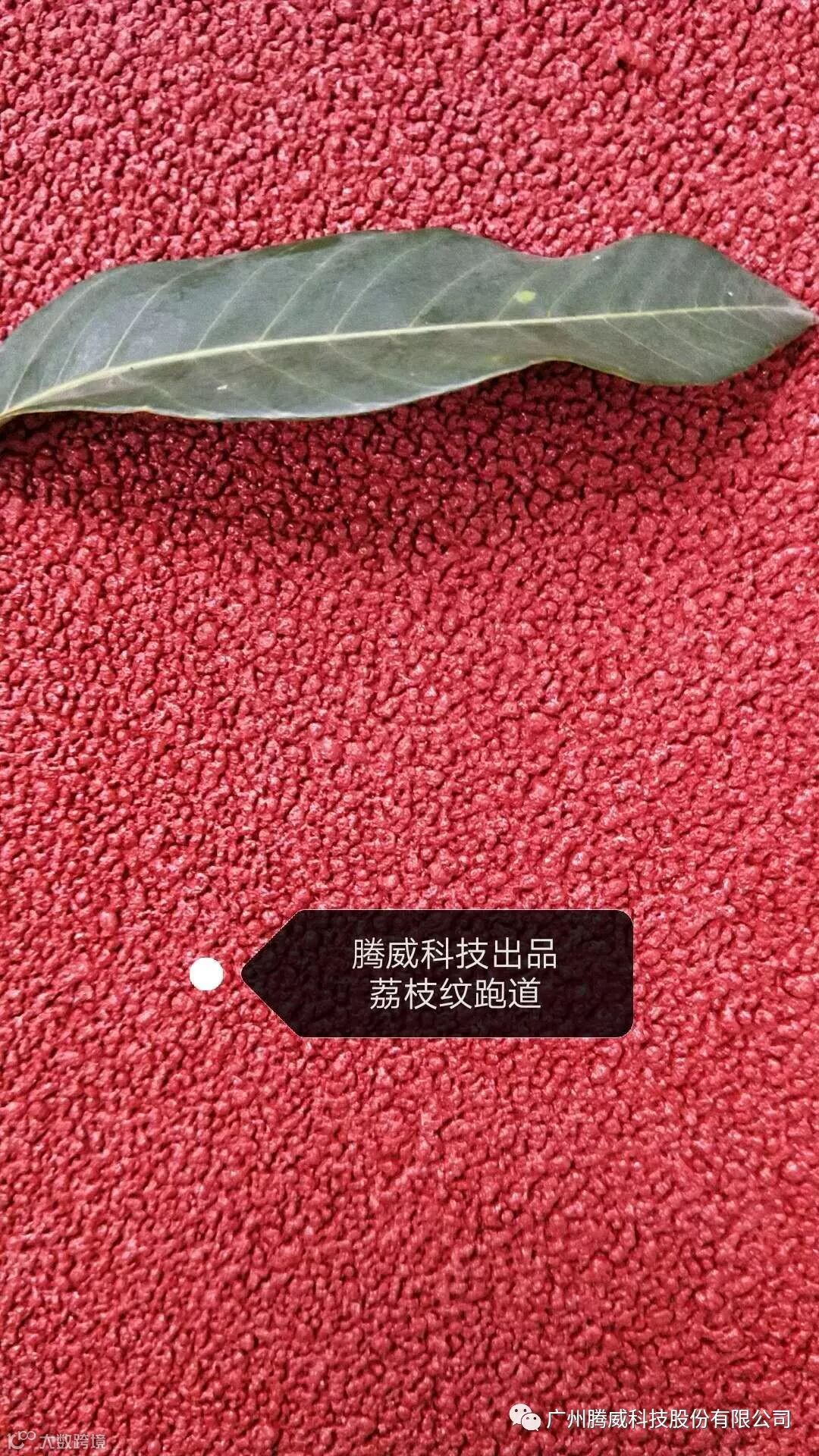 2、美观实用:腾威科技研制的荔枝纹、龙鳞纹及波浪纹塑胶自结纹喷面料是一种全天候跑道面层,纹路立体感强,雨后排水畅快。雨后立即可用于训练和比赛及娱乐,干态湿态运动使用性能不变。