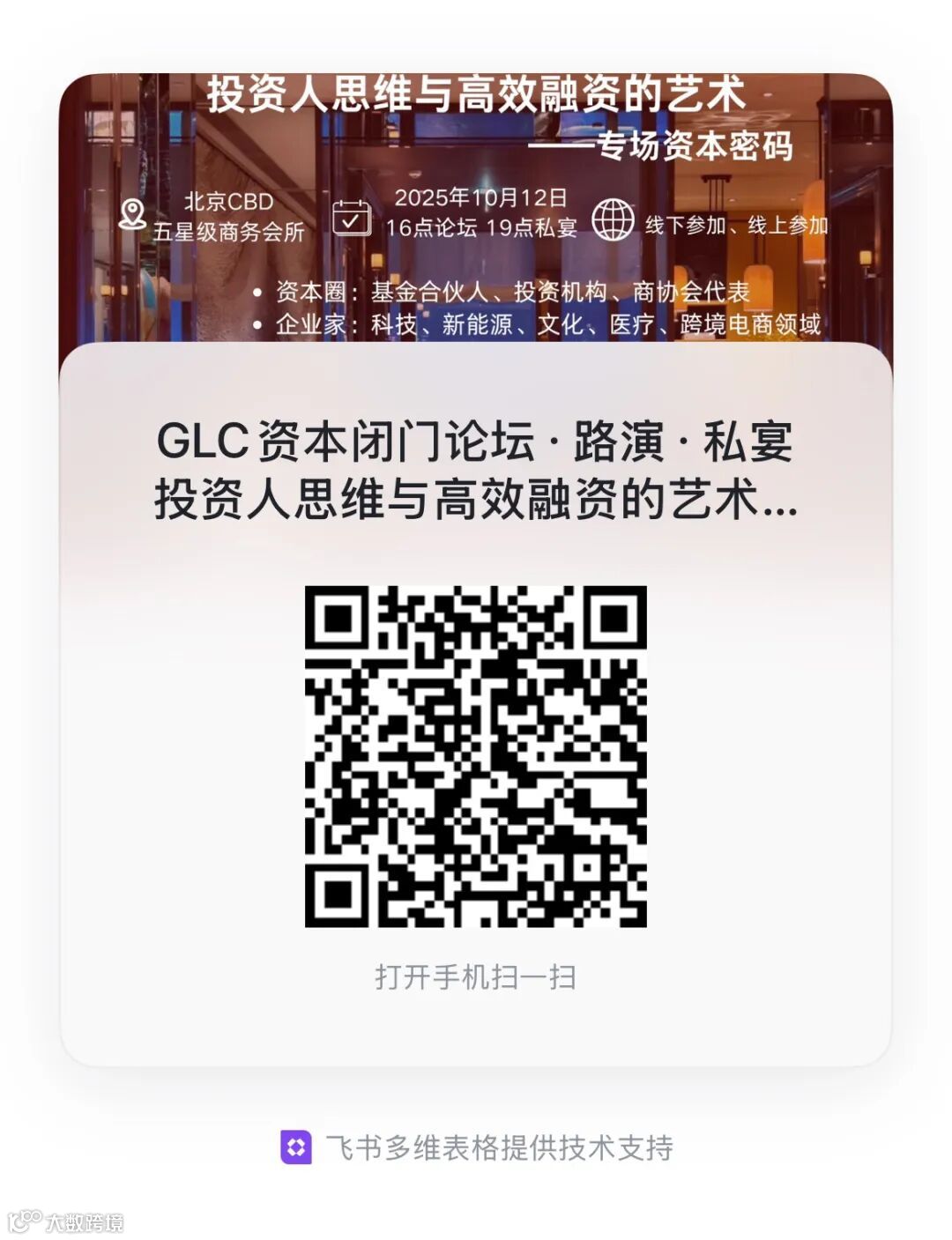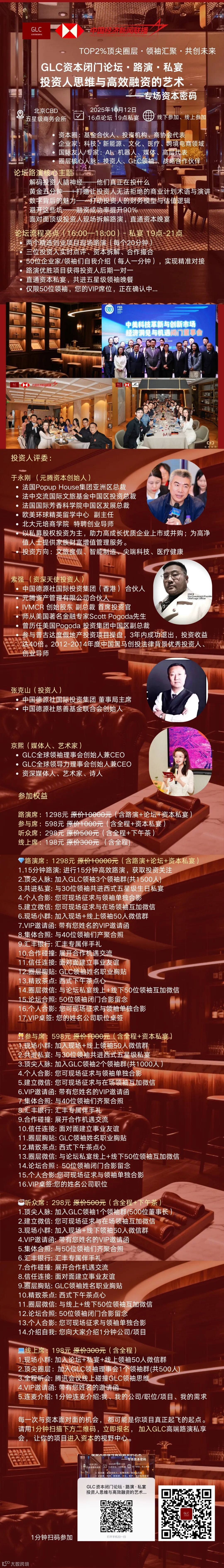 【10月12日周日15点与19点】GLC资本闭门论坛·路演·私宴-投资人思维与高效融资的艺术-线下和线上皆可参加