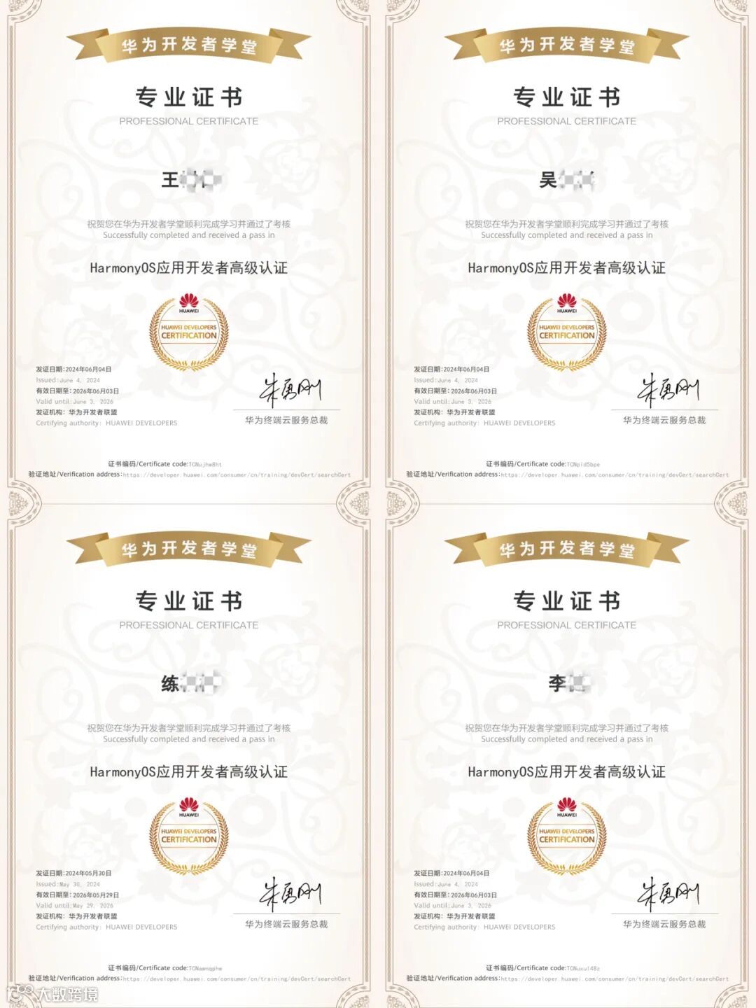 近日,在我司开发同事努力学习奋斗以及华为终端云服务开发者产品部支持下,成功考取了《HarmonyOS应用开发者高级认证》证书。