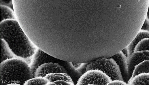 优质树脂瓦表面致密,通过模仿荷叶的微观结构,一个个小乳突的表面让液滴与瓦的接触面积减少,液滴只能停留在乳突尖端上(如下图),空气封在乳突中间,液滴被支撑起来。