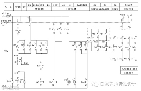 1.消防联动控制器手动控制盘上只设置一组手动启动(SF2)和停止按钮(SF3),消防手动控制排烟(加压送风)启、停。联动触发信号为有源DC24V信号(KA1)。