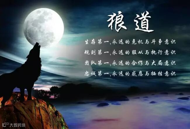 狼性的四大特点:"贪""残""野""暴";都应在团队文化中得以再现,那就是对工作、对事业要有"贪性",无止境地去拼搏、探索;狼性的"残"用在工作中,便是指对待工作中的困难要一个个地、毫不留情地把它们克服掉、消灭掉;狼性文化的"野",便指这种在工作中、事业开拓中不要命的拼搏精神;狼性中的"暴"则是指在工作的逆境中,要粗暴地对待一个又一个难关,不能对难关仁慈。
