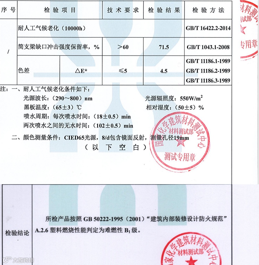 国家检测中心耐人工气候老化性能(老化化验时间10000h)进行判定,所检项目均达到标准要求。