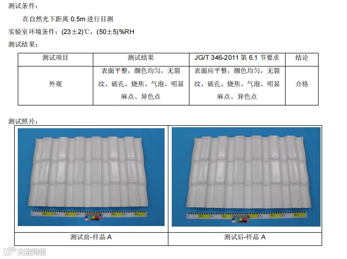 在建筑材料领域,品质与安全永远是我们追求的目标,共力ASA树脂瓦在SGS、CE、CNAS等国际平台上凭借其卓越的品质和优异的性能,赢得了市场的广泛认可和用户的信赖,还有很多很多测试项目,如:软化测试、冲击强度、拉伸断裂强度、耐应力开裂等均达到标准要求。