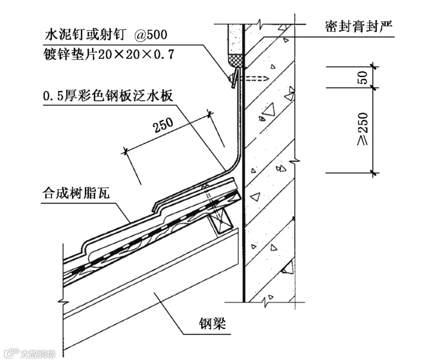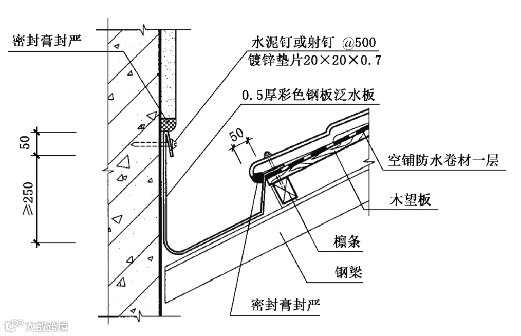 ● 正面上泛水时,将泛水板下端固定在构筑物腰线下面,上端固定在挂瓦条(檩条)上面。
