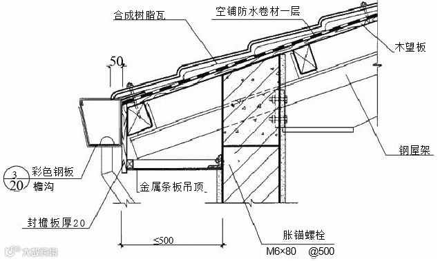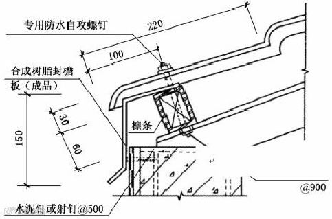 ● 将钢板或合成树脂板檐沟前端伸入檐沟,末端固定在檐口及挂瓦条(檩条)上;