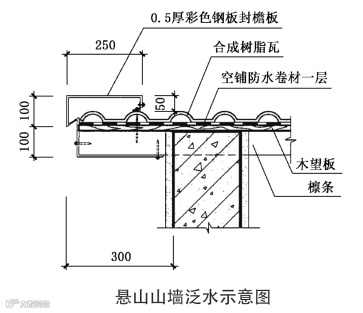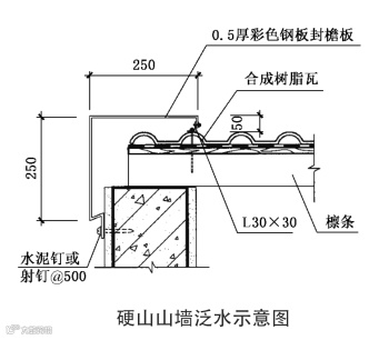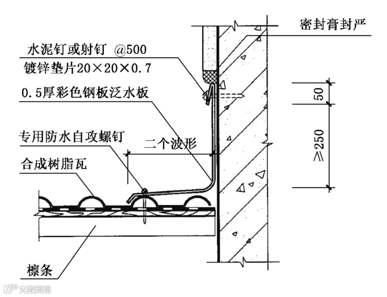檐口瓦与墙面之间加装泛水板,泛水板下涂抹防水胶,上用膨胀螺丝固定,间距 30cm / 颗。