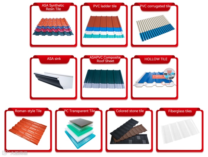 7大系列:ASA树脂瓦系列、中空隔热瓦系列、A-PVC系列、PVC系列、透明瓦系列、彩石瓦系列、水槽系列;