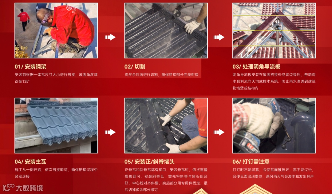 安装前一体瓦尺寸大小进行搭接,坡面角度建议在135°;
