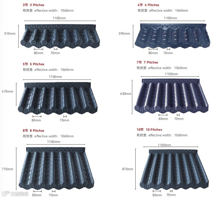 4.规格齐全,色彩多样: 仿古一体瓦规格有3/4/5/7/8/10/13,其中配件有正吻、翘脚、转角、末端、直角正吻;
