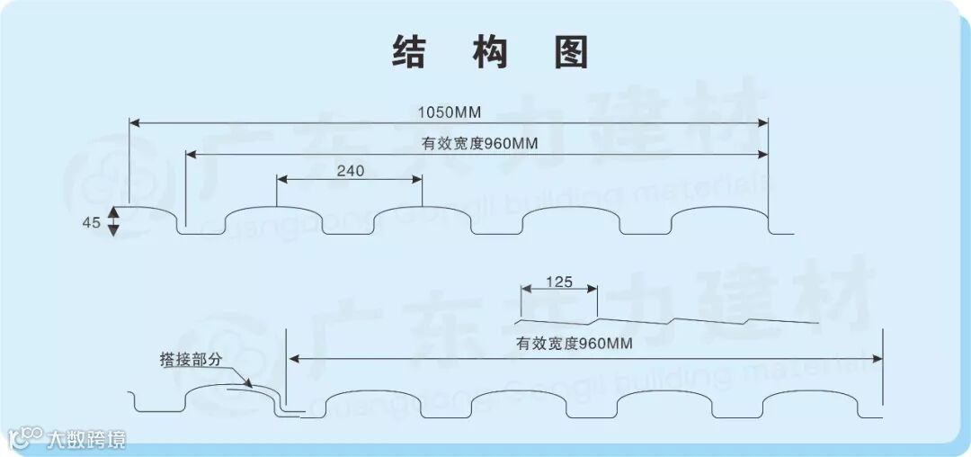 共力ASA小青瓦采用先进的三层共挤技术一次加工而成,规格:宽度1050mm,有效宽960mm,波距240mm,波高45mm,节距125mm,长度按节距倍数订做。