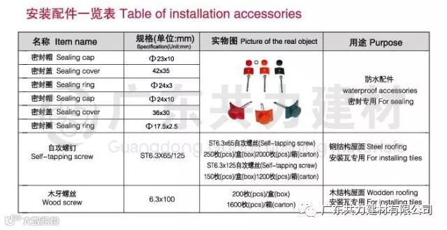 主瓦安装选用直径4mm、长度75mm的自攻钉;正脊瓦、斜脊瓦安装根据固定位置的不同,选用直径4mm,长度110-150mm的自攻钉。