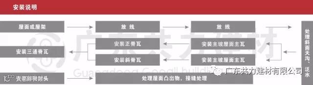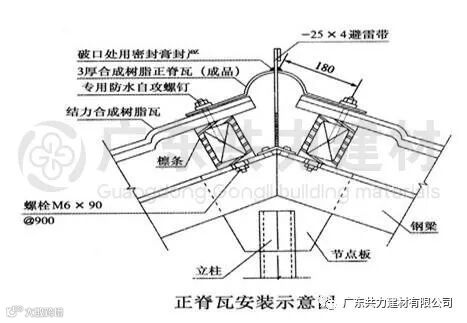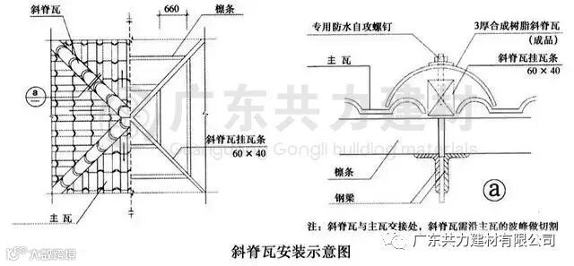 斜脊瓦安装在多坡屋面三角形斜边上,安装时要上下对齐固定在主瓦檩条上,两节斜脊瓦之间搭接30mm,最后安装脊瓦末端。