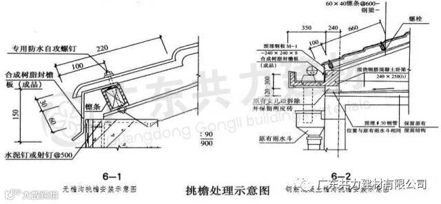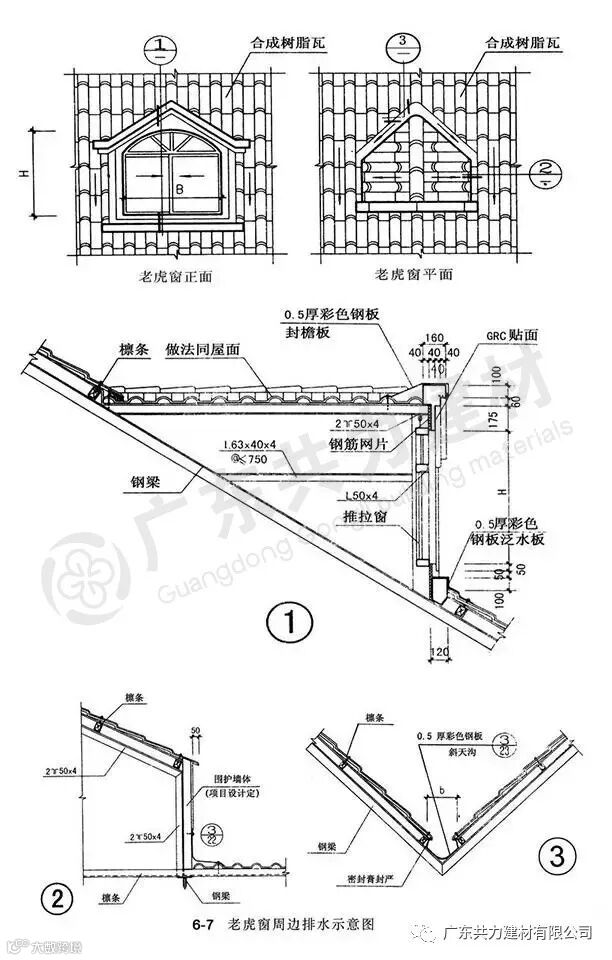 为使老虎窗上面雨水有效排泄,应在老虎窗上方两侧设置排水槽,安装施工按照立墙泛水方法处理。