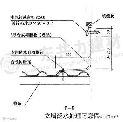 立墙泛水是指屋面瓦位于构筑物两侧斜面相交,可将金属板根据现场尺寸加工定制泛水型板,上端固定在构筑物腰线下面,下方固定在瓦面上。