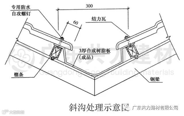 屋面斜天沟可采用宽度1000mm、厚度0.5mm彩钢板,或宽度800mm、厚度3.0mm的合成树脂板等材料,根据现场结构配套定制,在主瓦安装前先将天沟型板固定在檩条上,外露部分宽度为200mm~300mm。