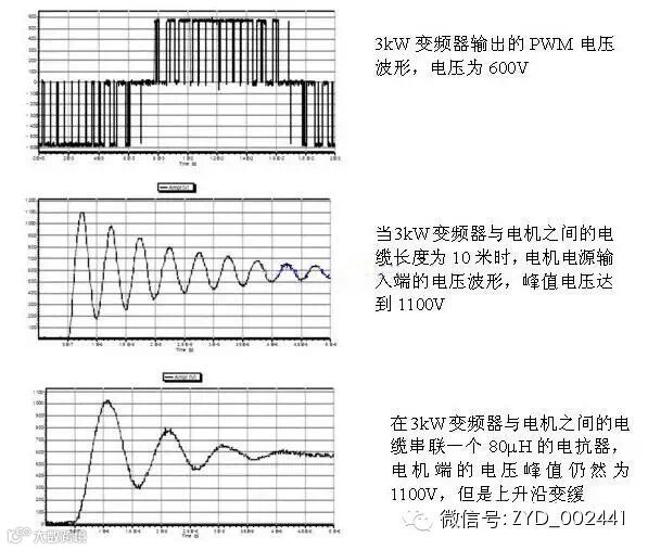 因此,在使用变频器驱动电机时,必须对电机损伤的问题有足够的重视。简而言之,当变频器输出PWM电压波形的脉冲沿较陡,电缆越长,越容易产生尖峰电压,就容易产生损伤电机绕组的尖峰电压。