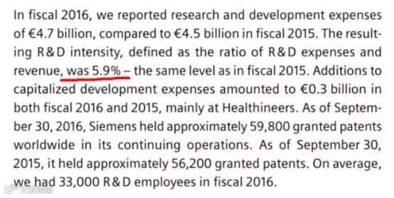 打开西门子2016财年的财务报告,数据明确告诉我们,公司在研发方面的投入高达47亿欧元,的确占全年收入的5.9%左右,这个比例也是德国制造业(数据来自德国联邦技术部)的平均研发强度。