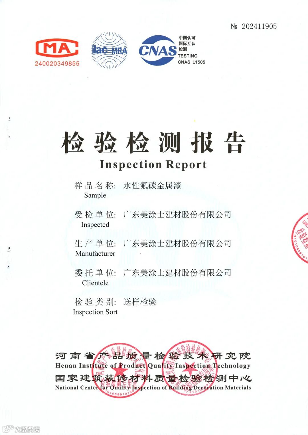 而美涂士水性氟碳金属漆在满足外立面装饰要求的同时,也完全满足第三方检测标准,在耐碱性、耐候性等方面均表现优异。