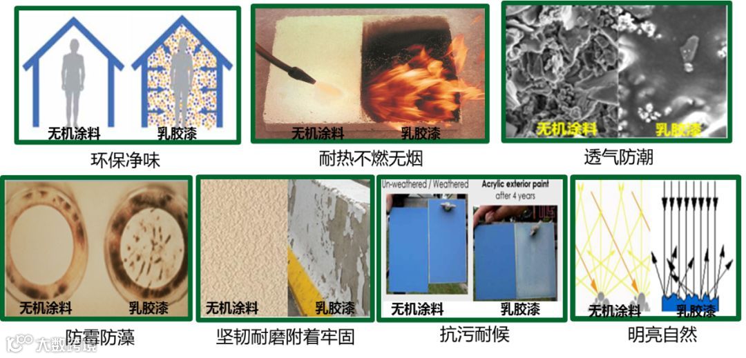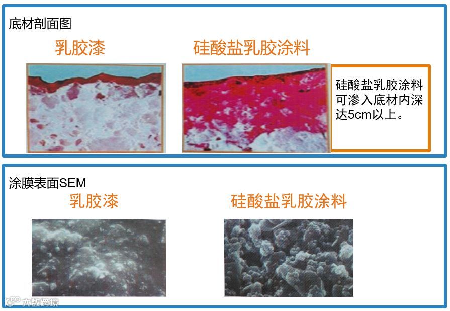 无机硅酸盐涂料和墙体发生硅化反应,超细的矿物分子可以渗入基材0.5-2MM,形成一个稳定而牢固的硅酸盐体系,墙材合一,成为墙体的一部分,其超耐久性非乳胶漆可比拟,比目前市场上的乳胶漆寿命高出2-3倍。